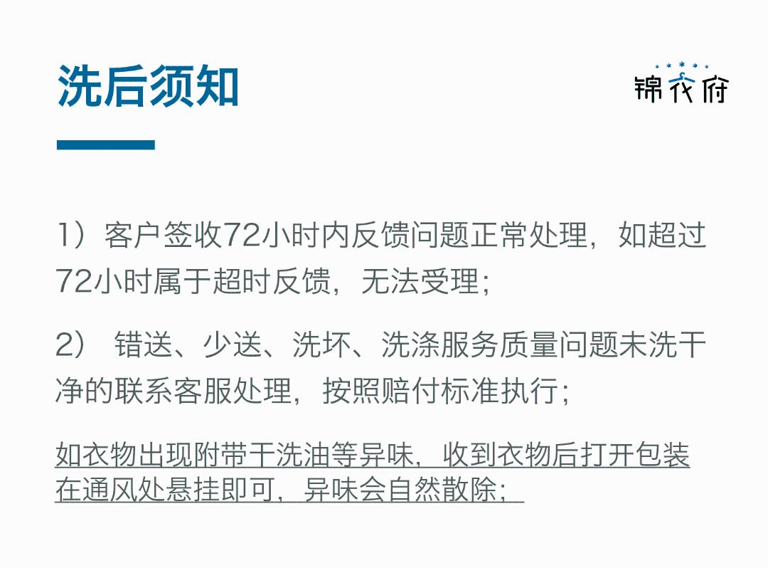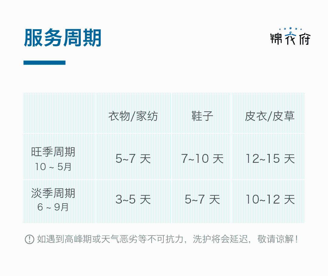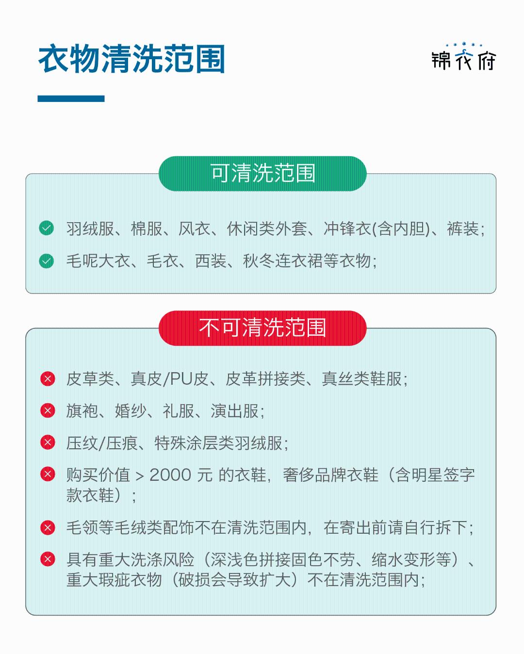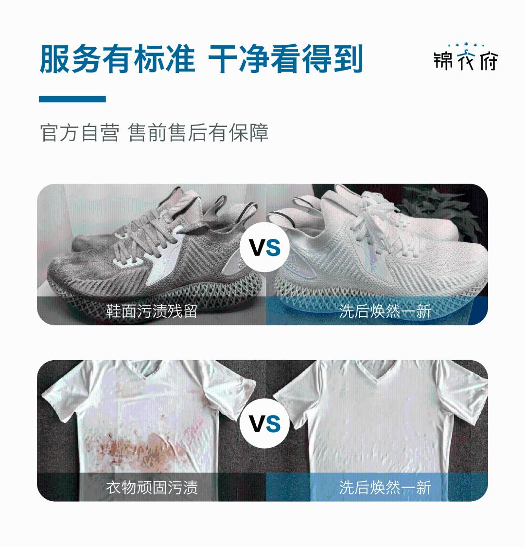 衣/鞋任意洗不限长/中/短,不限薄/厚,快递免费上门取送。 清洗范围内: 鞋类:布面、网面、革面等普通材质的运动鞋、皮鞋,且价值2000元以下。 衣服:羽绒服、棉服、毛呢大衣、毛衣、西装、衬衫、 T 恤、休闲外套、裤装等价值2000元以下的服饰。 洗护时效: 周期5-7天 清洗范围外: 1.皮草类、真皮/ PU 皮、皮革类、真丝类材质的衣服或含以上材质的拼接类衣服;2.旗袍、婚纱、礼服、演出服、少数民族等服饰; 3.购买价值大于2000元的衣服、奢侈品类衣服、有明星签字或有纪念意义的衣服; 4.毛领等毛绒类配饰不在清洗范围内(寄出前请自行摘下); 5.具有重大洗涤风险的衣服,如多色拼接、固色不牢、缩水变形等衣服;具有重大瑕疵鞋子,破损、磨损、开线等衣服; 6.宠物衣物、湿的衣物、大面积血迹衣物、医疗相关衣物、丧失穿着价值的衣物等。 温馨提示: 1.请您仔细鉴别衣服材质,若您寄出的衣服超出清洗范围,或需要额外的维修、补色服务,客服将与您联系,根据您的清洗需求沟通补差价或退洗。 2.如冲锋衣或羽绒服等含内外夹层的衣服,按2件清洗产品计算请您下单时注意。